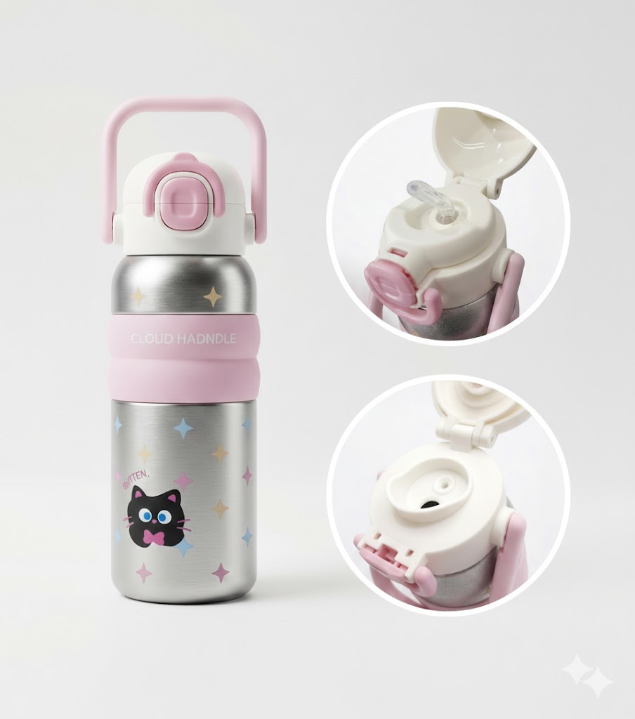 Facilita la hidratación de tu pequeño con esta adorable botella térmica que cuenta con un versátil sistema de doble pico, permitiéndole elegir entre sorbete o flujo directo a medida que crece. Su cuerpo de acero inoxidable es ultra resistente y mantiene la temperatura ideal, mientras que su agarre ergonómico está diseñado perfectamente para que sus manitos la lleven sin esfuerzo. ¡Es la compañera más segura, práctica y bonita para que lleven al colegio o al parque todos los días!