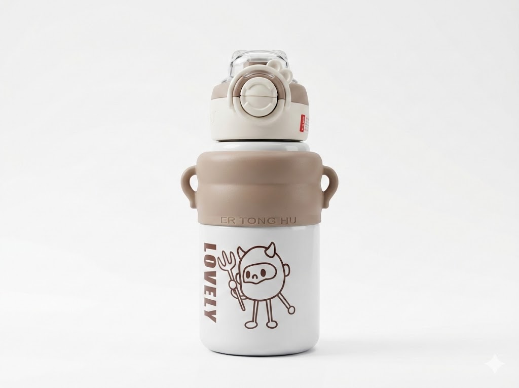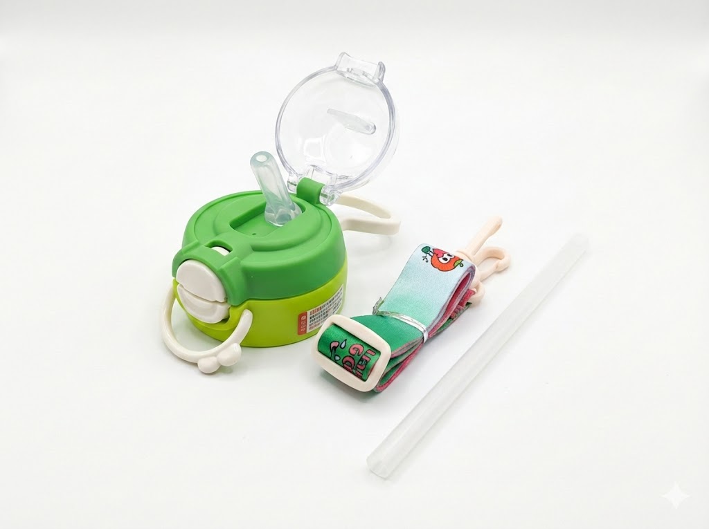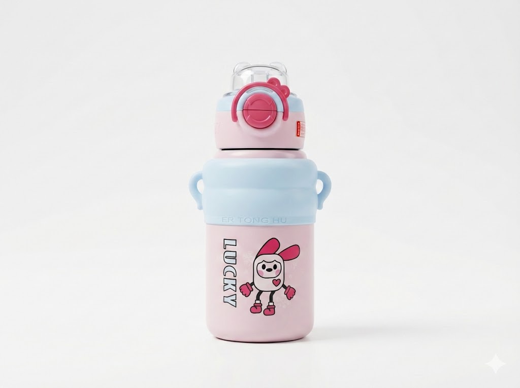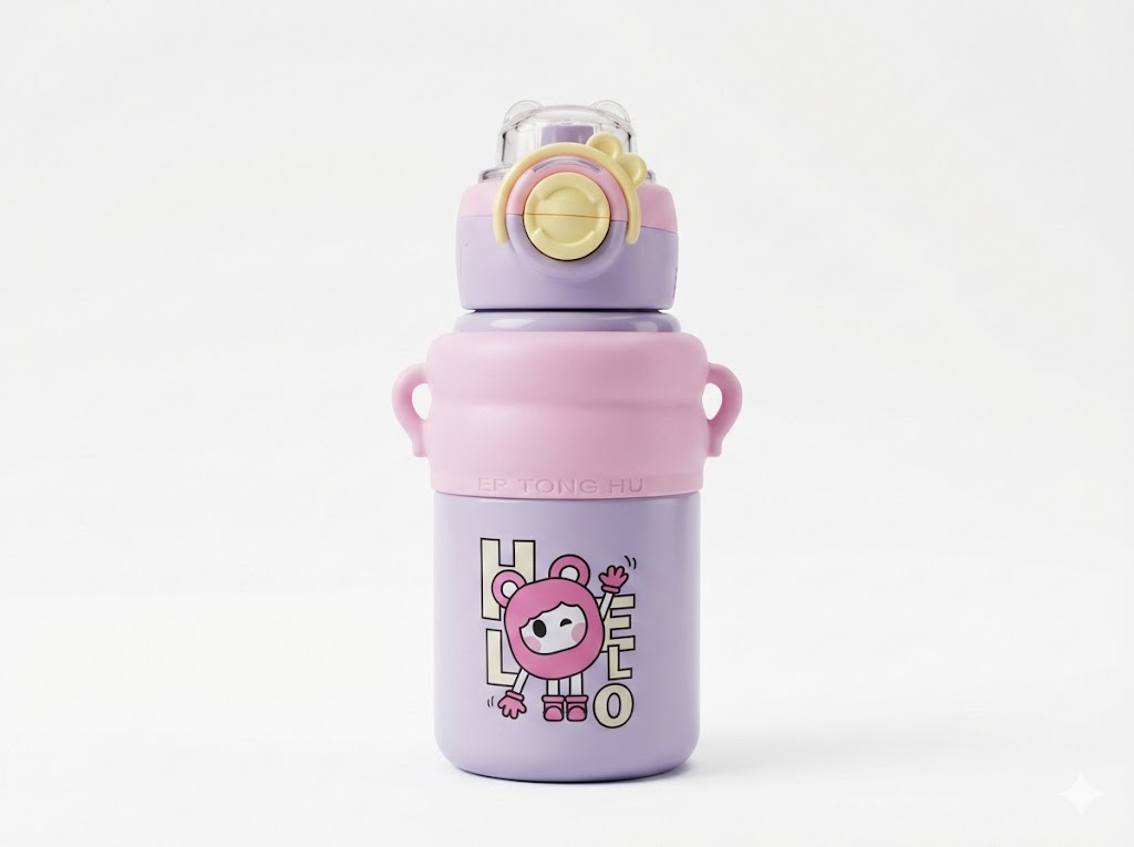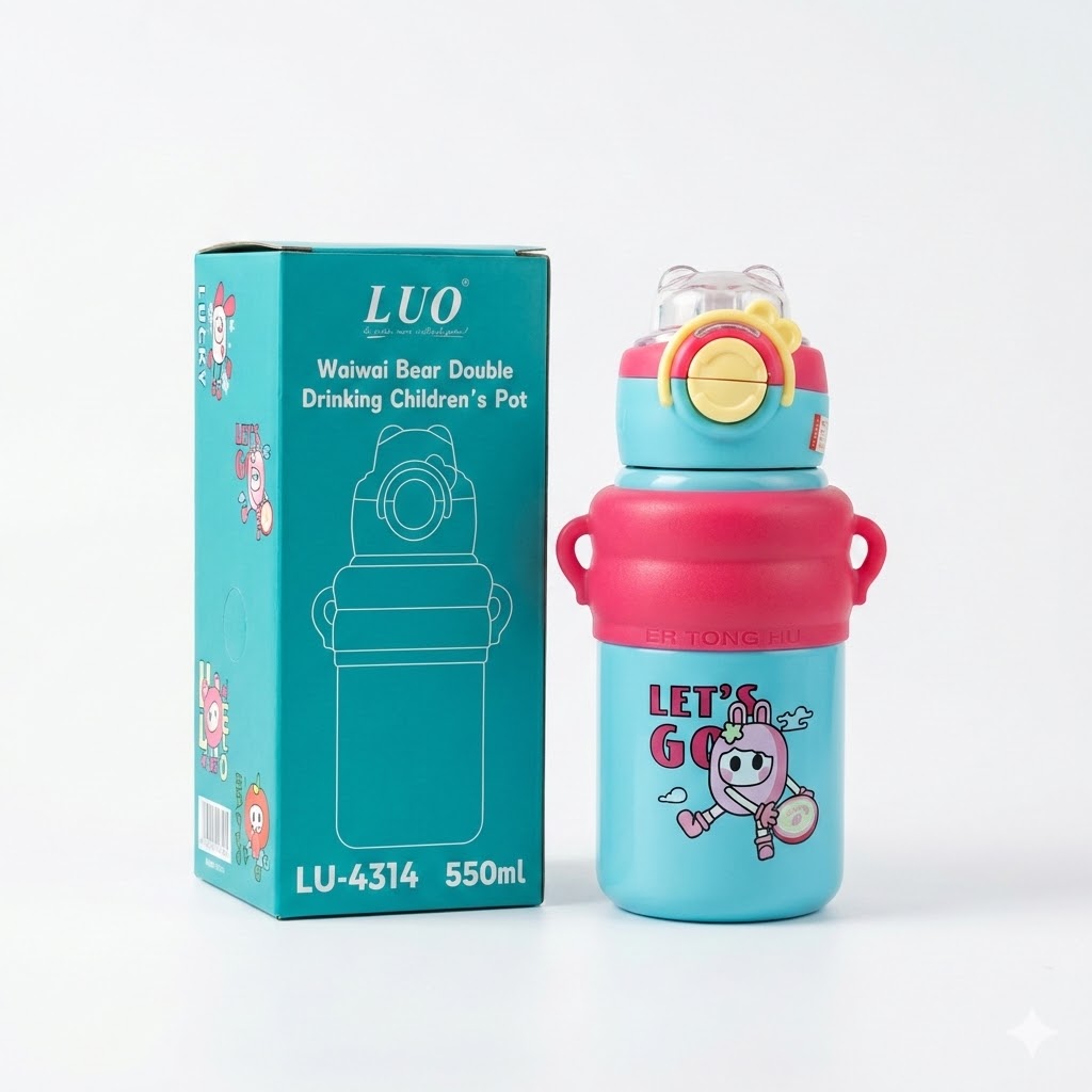 Esta botella infantil de 550ml destaca por su diseño adorable y funcional, ofreciendo dos formas de beber (pajita y boquilla) junto con una funda de silicona protectora. Disponible en una gama de colores vibrantes con correa ajustable a juego, es la compañera perfecta y resistente para la escuela o las aventuras diarias.