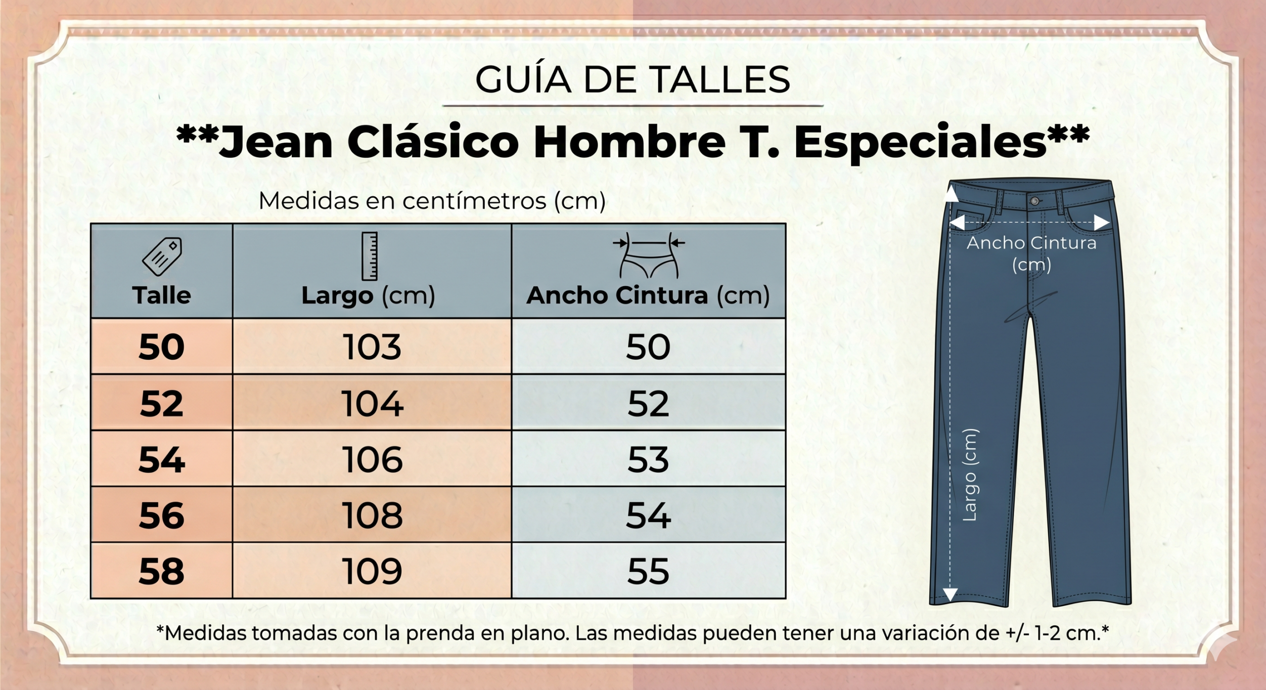 Talles Reales: Confeccionados pensando en la comodidad del hombre, asegurando un calce cómodo en cintura y piernas.
