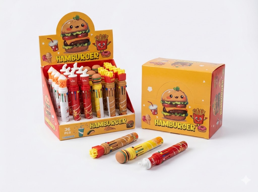Potencia tu mostrador con esta caja exhibidora de 36 lapiceras multicolor, un producto de ‘compra por impulso’ garantizada gracias a su atractivo diseño y bajo costo unitario. El pack incluye un surtido equilibrado de los 4 modelos de comida rápida (hamburguesa, papas, gaseosa y helado), listos para captar la atención de niños y estudiantes al instante. Es la inversión ideal para librerías y regalerías que buscan mercadería de alta rotación y excelente margen de ganancia.