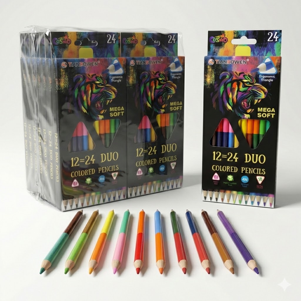 Optimiza tu inventario con nuestros sets de lápices doble punta, presentados en una práctica caja cerrada de 12 unidades, diseñada para una exhibición atractiva y una rotación rápida en tu punto de venta. Cada cajita individual, con 24 colores por set, garantiza un atractivo irresistible para los clientes finales, asegurando ventas recurrentes y márgenes sólidos. Ofrece a tus compradores la combinación ideal de funcionalidad y diversión con un producto que destaca por su calidad y su empaque visualmente impactante.