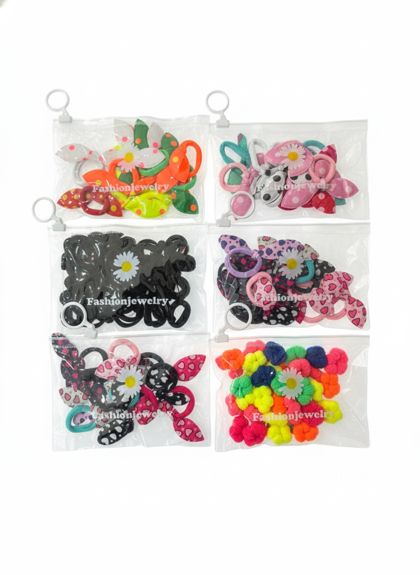 Este paquete de colitas para nena incluye una variedad de diseños coloridos con detalles de moños, corazones y flores. Están confeccionadas con materiales suaves y elásticos que aseguran un peinado firme sin dañar el cabello delicado. Cada set viene organizado en una práctica bolsa con cierre hermético, ideal para mantener los accesorios ordenados o para llevar de viaje. Es el complemento perfecto para añadir un toque divertido y femenino a cualquier look infantil diario.