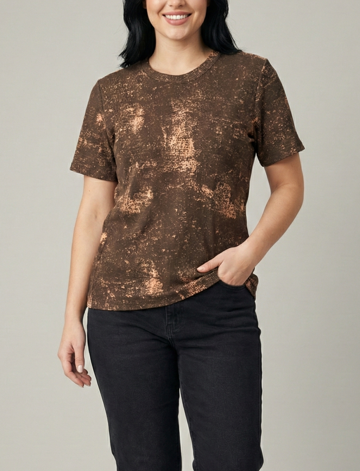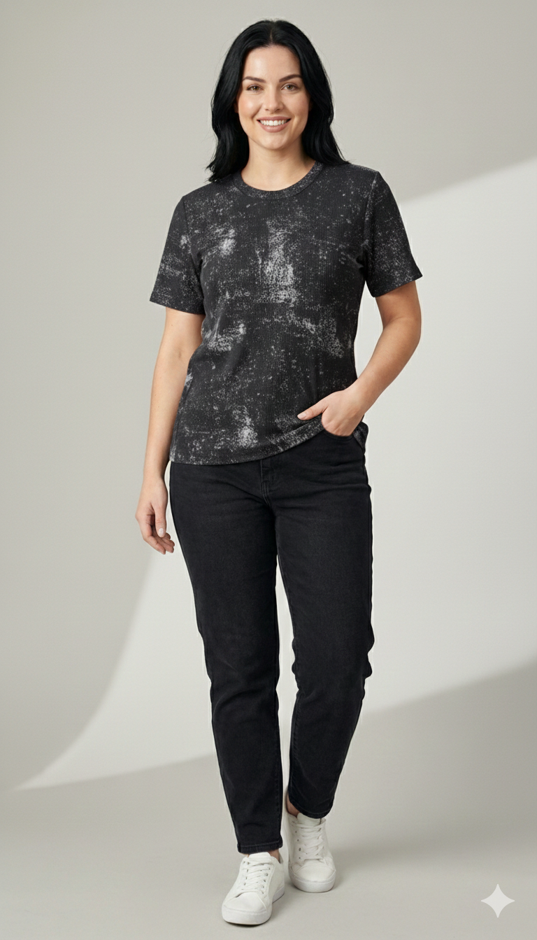 Esta remera de cuello redondo y manga corta presenta un distintivo acabado batik que crea un patrón orgánico y texturizado en toda la prenda. Su corte clásico y relajado ofrece una silueta cómoda, ideal para un estilo urbano y moderno. Está confeccionada con un tejido suave que garantiza frescura y durabilidad para el uso cotidiano. Es una pieza versátil que aporta un toque artístico y dinámico a cualquier conjunto informal.