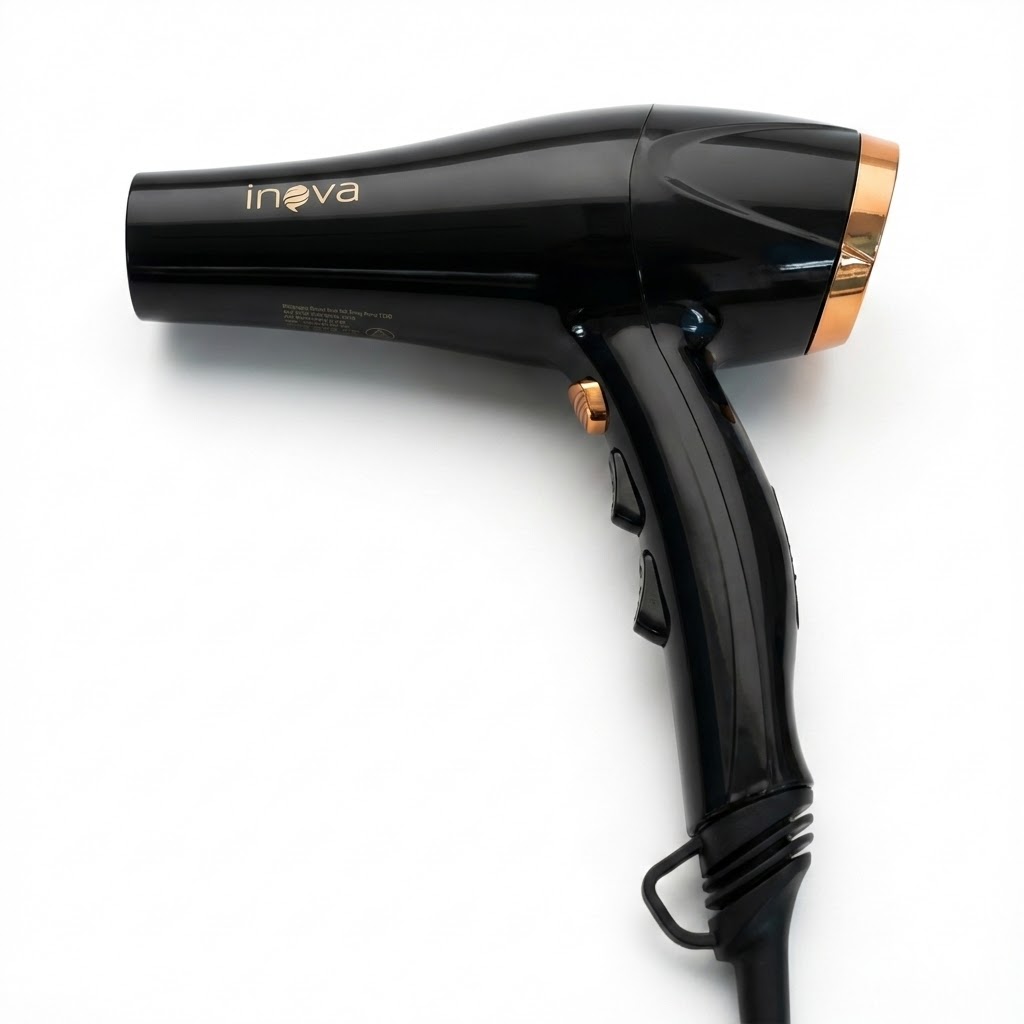 Este elegante secador de pelo destaca por su acabado en negro brillante acentuado con sofisticados detalles en dorado cobrizo. Su diseño ergonómico y moderno ofrece un agarre cómodo, integrando controles intuitivos en el mango para un uso sencillo. Es una herramienta de estilismo que combina perfectamente una funcionalidad profesional con una estética minimalista y premium.