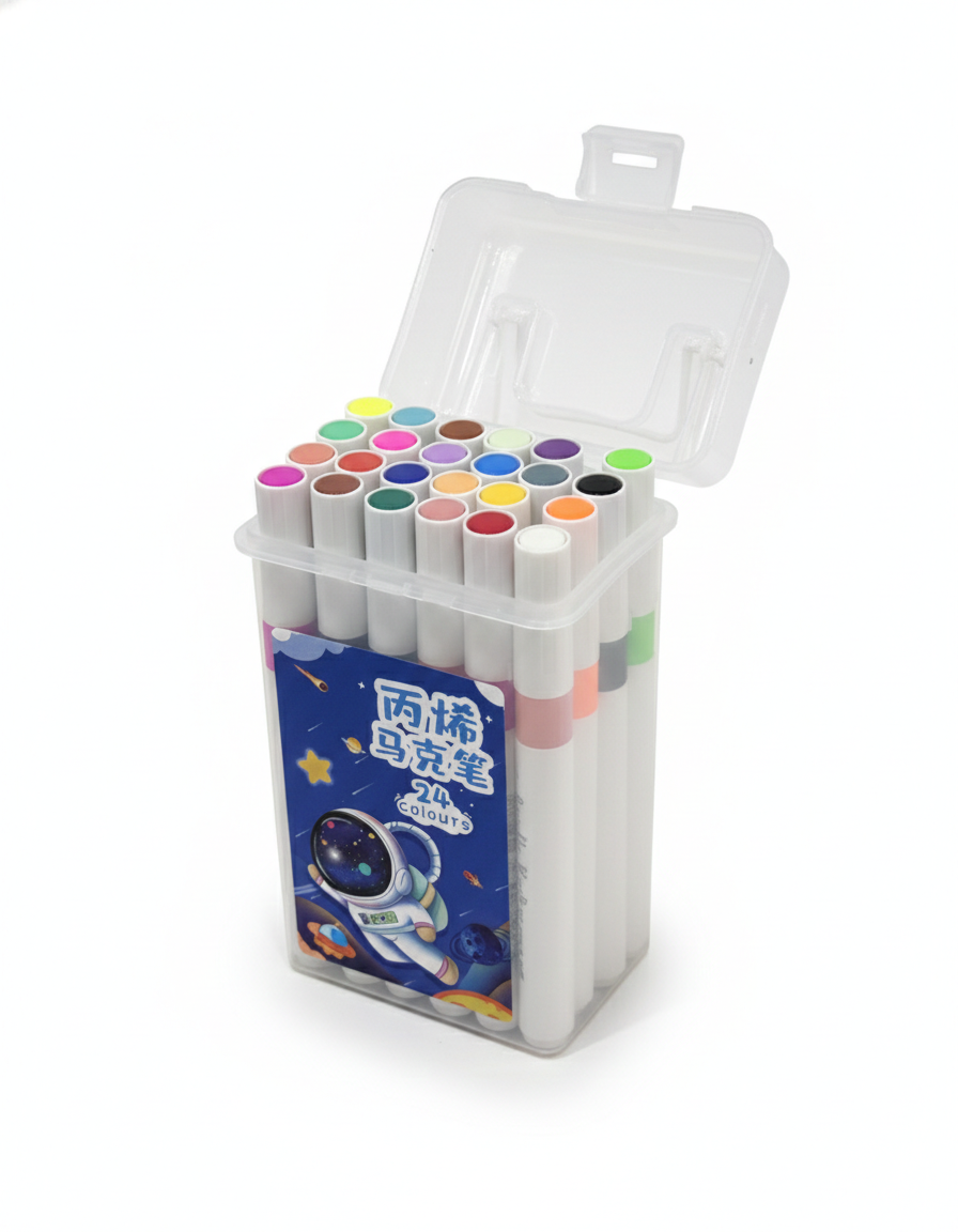 Desbloquea tu potencial creativo con este set completo de 24 marcadores acrílicos de alta fidelidad. A diferencia de los marcadores tradicionales, la tinta acrílica ofrece una cobertura opaca y vibrante que permite pintar sobre casi cualquier superficie, desde papel y cartón hasta madera, vidrio, metal y tela.