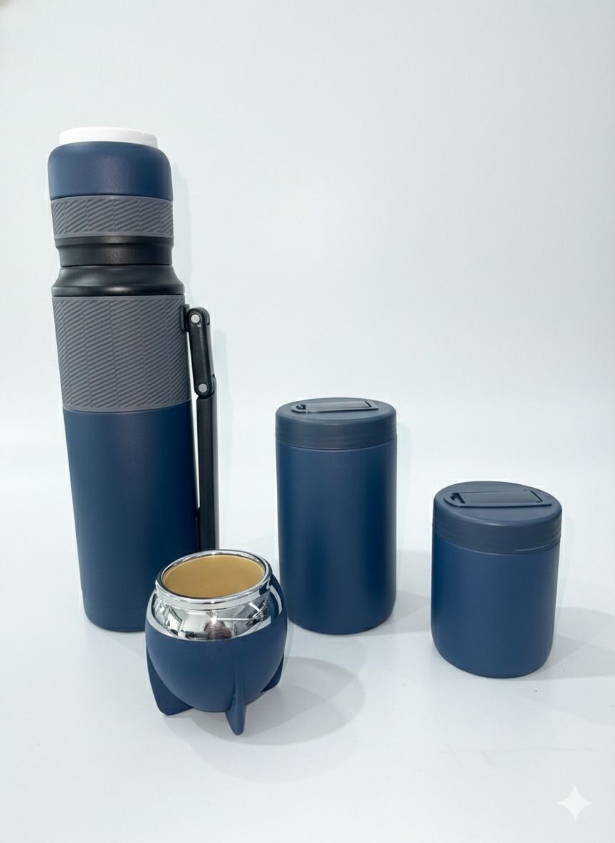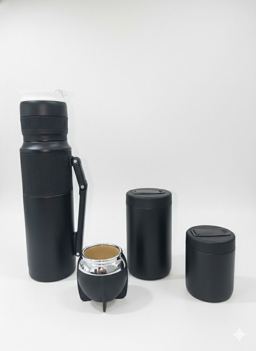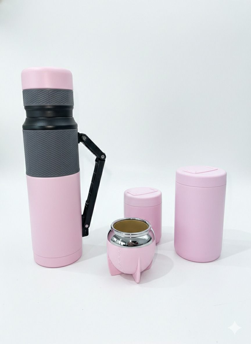 Termo de Acero Inoxidable: Con manija rebatible y grip antideslizante.