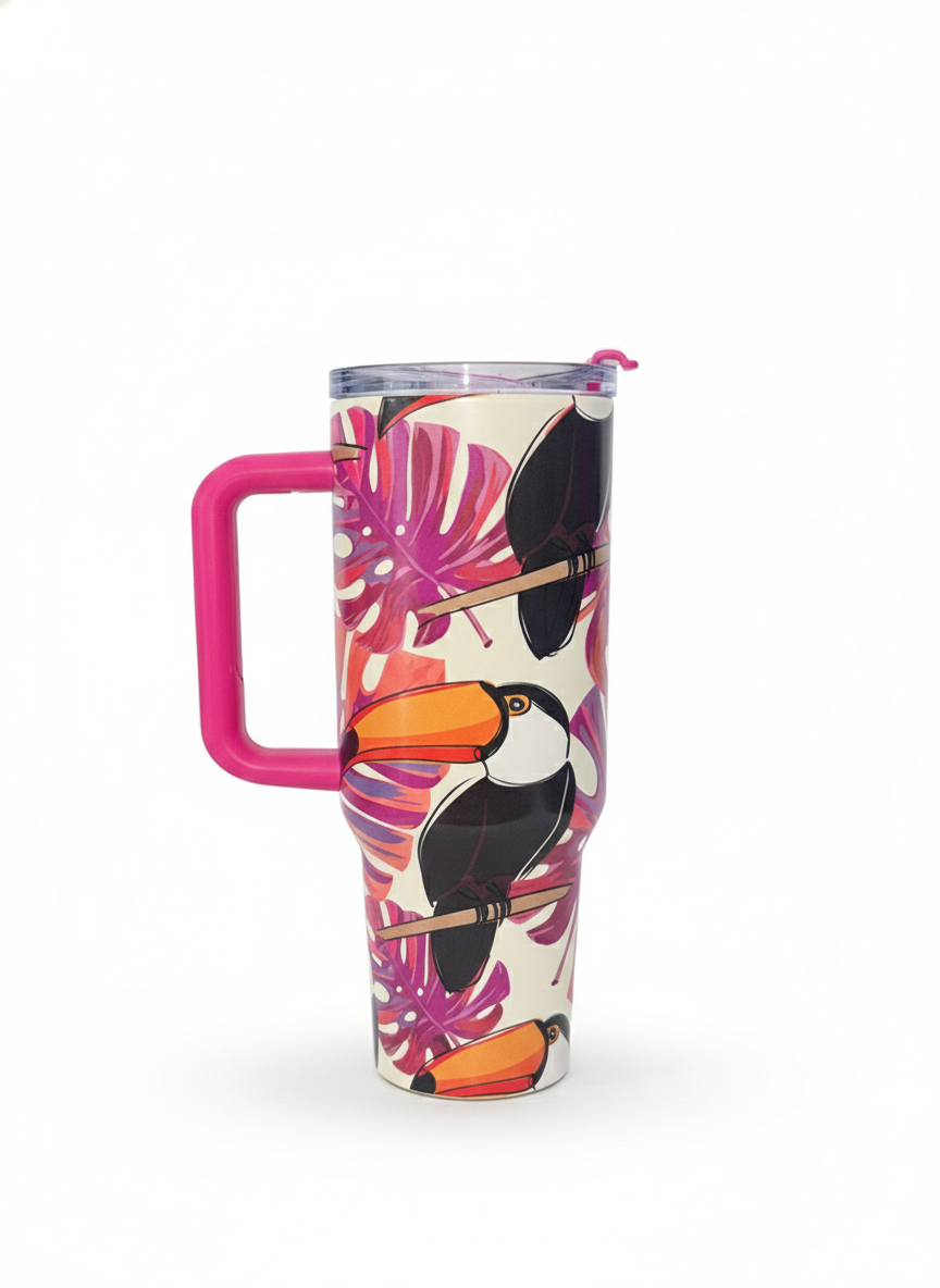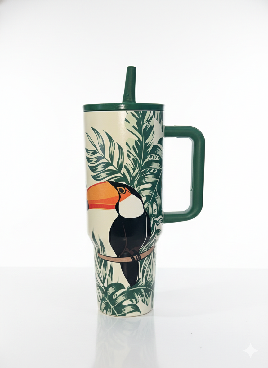 Dale un toque de color a tu rutina con este vaso térmico de gran capacidad. Con un diseño inspirado en la fauna tropical que incluye tucanes y guacamayos, este vaso no solo es un accesorio funcional, sino una verdadera pieza de diseño. Su estructura robusta y su sistema de sorbete lo convierten en el compañero ideal para mantenerte hidratado en la oficina, el auto o el gimnasio.